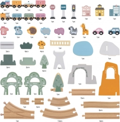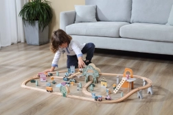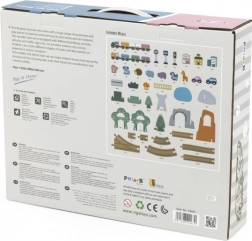 Legen er sikker og holdbar: glatte kanter, vandbaserede farver og massivt træ er skånsomt for både børn og natur. Når børn håndterer skinner og tilbehør, træner de hånd-øje-koordination, logisk tænkning og samarbejde i den fælles leg.
