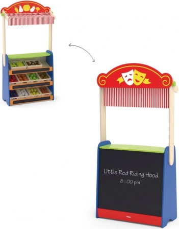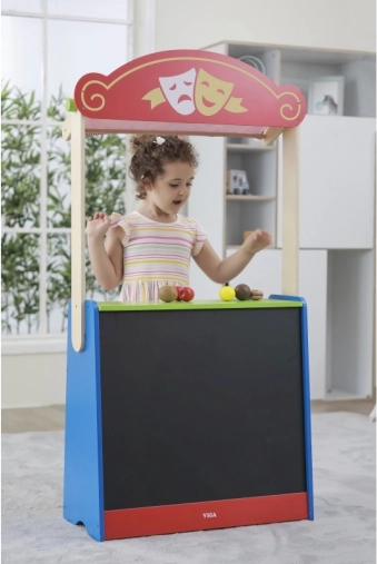 Denne kvalitetslegetøj i træ kombinerer hjemme-lukketeater og børnebutik i ét. Børn kan skifte scener og roller på et øjeblik – når der spilles eventyr, trækkes gardinet for, og på den sorte tavle skrives forestillingens titel; ved butikleg skrives butikkens navn, priser eller tilbud.