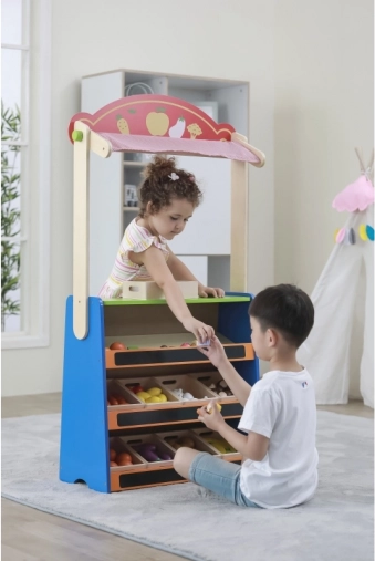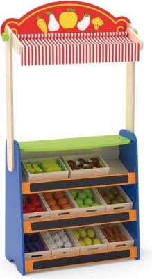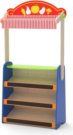 Standen tilbyder overskuelige hylder til opbevaring af madvarer og tilbehør (sælges separat). Robust udførelse, attraktive farvedetaljer og markise indbyder til kreativ leg og fælles aktiviteter. Legetøjet udvikler fantasi, kreativitet, logisk tænkning og kommunikation.