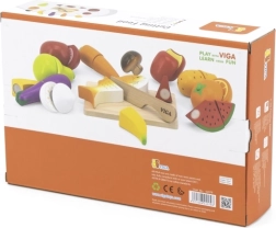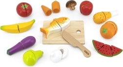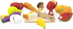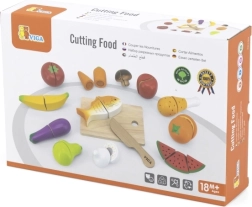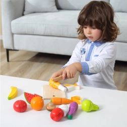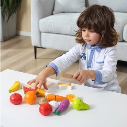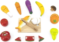 Dette kvalitets træ-sæt indeholder et varieret udvalg af frugter, grøntsager og andre madvarer – fra banan og melon til gulerod, tomat og fisk. Børn kan trygt øve sig i at skære med trækniven på skærebrættet og lære at genkende de enkelte madtyper, farver og former. Ideelt til selvstændig leg eller fælles madlavning med forældre.