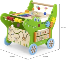 Opdag den multifunktionelle træ-walker i krokodilleform fra VIGA, som tilbyder op til 12 aktiviteter til både leg og læring. Den støtter de første skridt og udvikler fin- og grovmotorik, hånd-øje-koordination og logisk tænkning. Du finder her en xylofon, kugleramme, formsorteringsboks, tandhjul, labyrint og flere elementer, der motiverer børn til bevægelse og opdagelse.