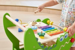 Xylofon, kugleramme, labyrint, tandhjul, formsorteringsboks, motorikbue og flere elementer holder børn engagerede og udvikler deres færdigheder på en legende måde.