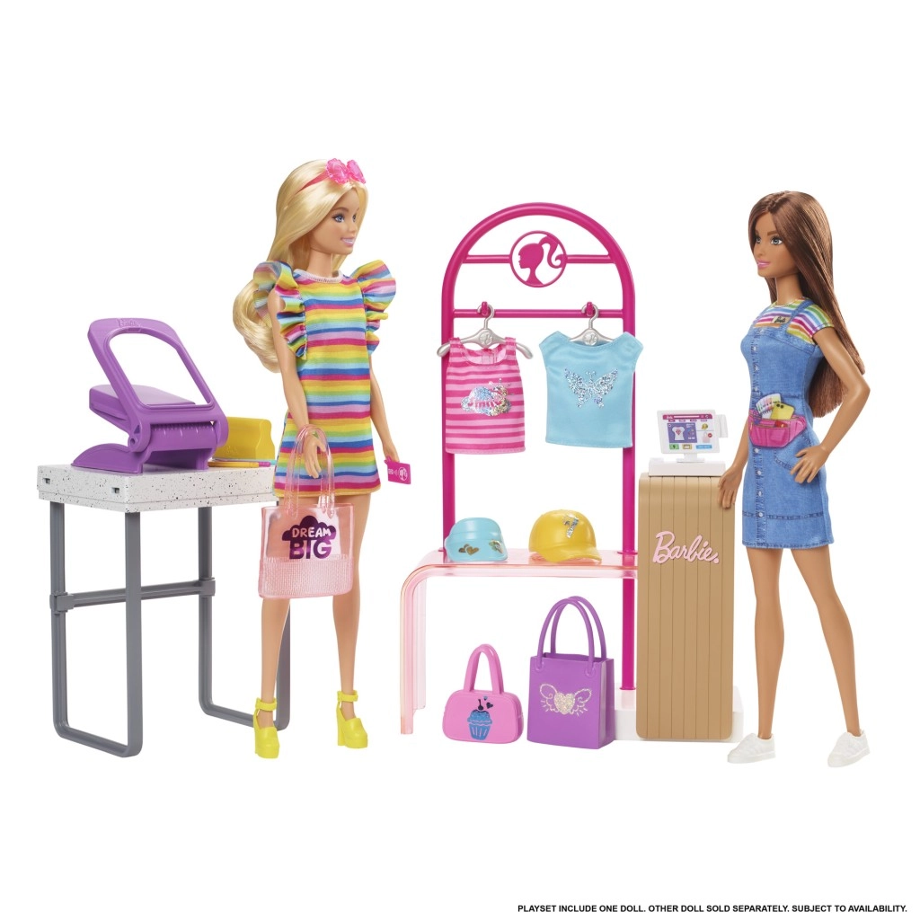 Barbie Modedesign-studie med dukke lader børn åbne deres egen butik med tøj og tilbyder tre måder at lege på: designe tøj, fremstille og sælge. Små modedesignere kan skabe unikke outfits ved hjælp af serigrafifunktionen på folie og dekorere dem med genanvendelige klistermærker for over 150 forskellige looks. Tøjstativet med bøjler er ideelt til at hænge de skabte outfits op, udstille dem og pakke dem til salg. Dukken kan ikke stå uden støtte. Alder 5+