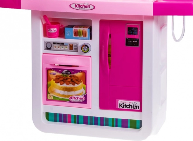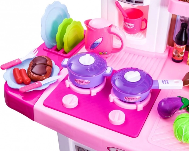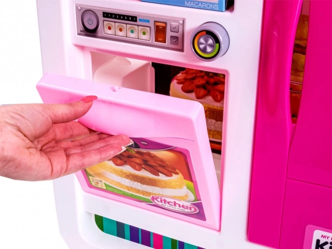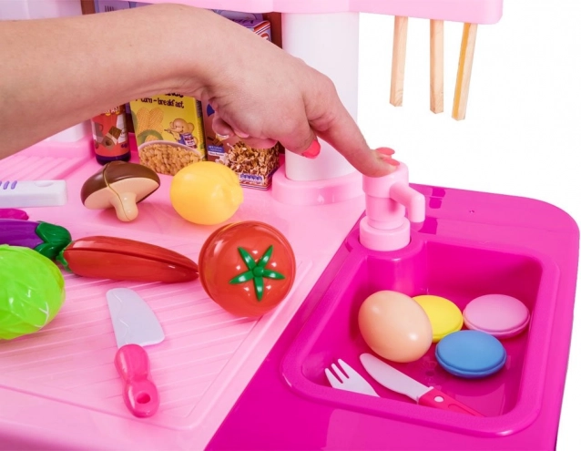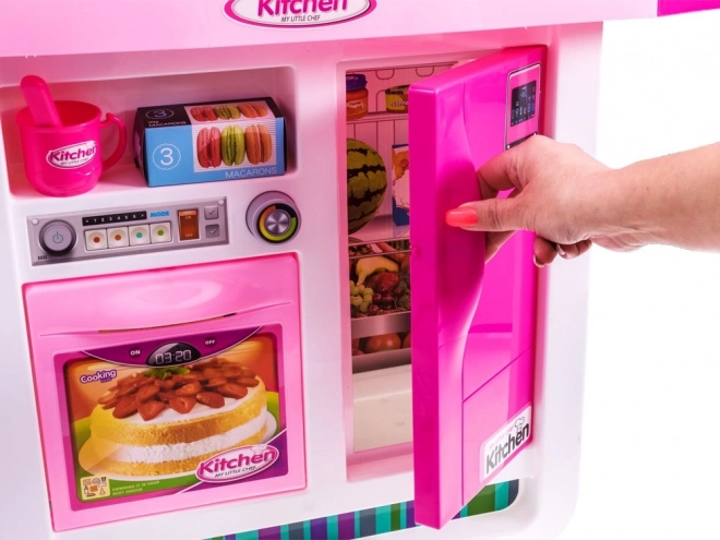 Vask med rindende vand, åbne-/lukkefunktion på ovn og køleskab, samt blus med lys og lyd – alt til autentisk rolleleg som kok.
