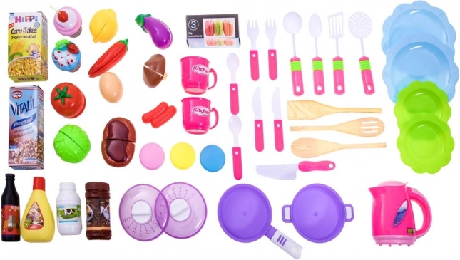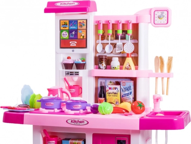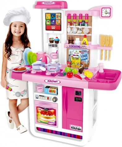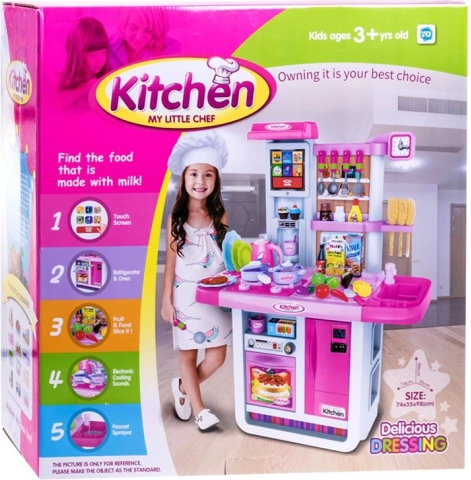 Det interaktive touchpanel tilbyder dyrelyde, musik og læring af tallene 1–10 på engelsk, populære sange, justerbar lydstyrke og telefonlyde. Det rige tilbehørssæt inkluderer skæregrønt med velcro, gryde og pande med låg, tallerkener, kopper, tekande, bestik samt imitationer af madvarer. Produkterne er ikke beregnet til indtagelse.
