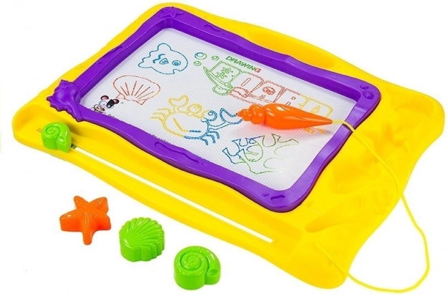 Opdag et sjovt og praktisk legetøj for små kunstnere – en magnetisk tegnetavle i havfarver med en farvet baggrund opdelt i 8 sektioner. Med magisk sletning via skyderen kan børn tegne igen og igen uden rod. Inkluderer 3 figurstempler (hjerte, stjerne, cirkel) og en ergonomisk stylus formet som en musling for behageligt greb og udvikling af kreativitet samt finmotorik.
