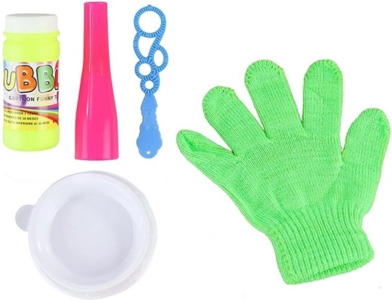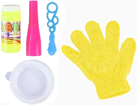 - Handsko (universalstørrelse), skål/sokkel til opløsning, boblestav, lyserød tragt/rør, flaske med bobleopløsning