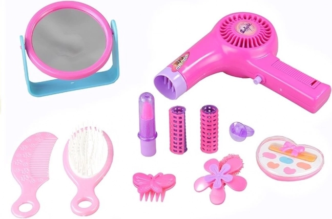 - Legetøjsføntørrer på batteri, spejl på stativ, børste, kam, 2× hårruller, sløjfe-hårspænde, elastik med blomst, skyggepalette, læbestift, ring