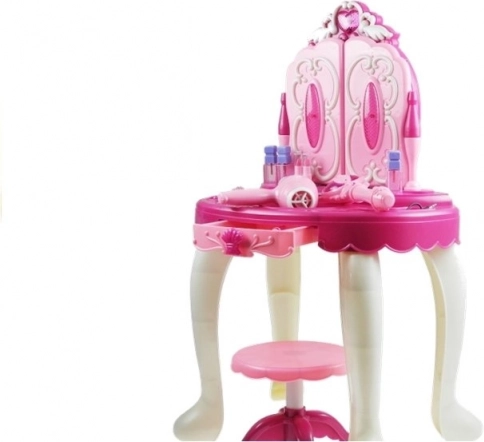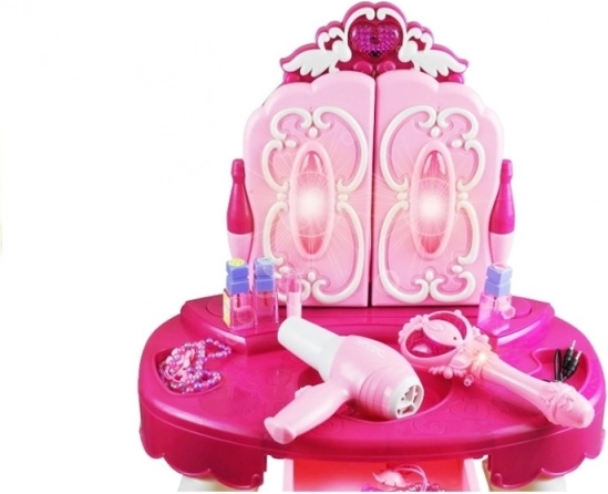 Dette store børne-toiletbord forvandler værelset til et eventyrligt kongerige. Spejlene åbnes med en tryllestav, ledsaget af en behagelig melodi og blinkende lys. Efter cirka 3 minutters inaktivitet lukkes spejlene automatisk. Bordet giver desuden mulighed for MP3-tilslutning, så yndlingssangene kan spille når som helst.