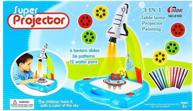 Raketten fungerer som projektor til tegning, dekorativt lys på børneværelset og et komplet kreativsæt med tuscher og aftørringsbar flade.