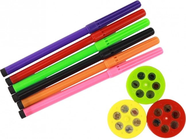 Sættet indeholder alt, hvad der er nødvendigt for sjov: 6 forskellige farvede penne og 2 sæt mønstre, der kan projekteres på væggen eller papir. I alt 12 billeder til skabelse.
