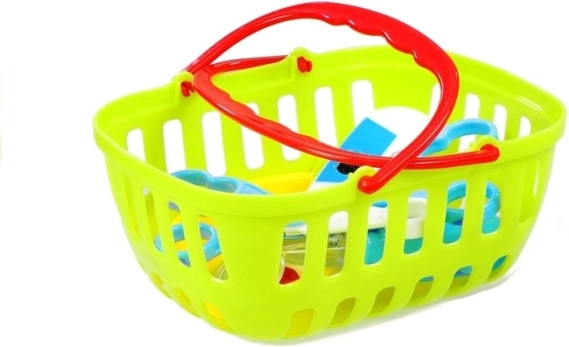- 4 hjul, håndtag, 2 hylder, kurv, tavle
