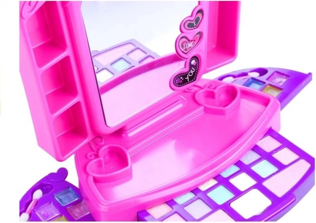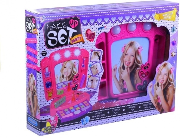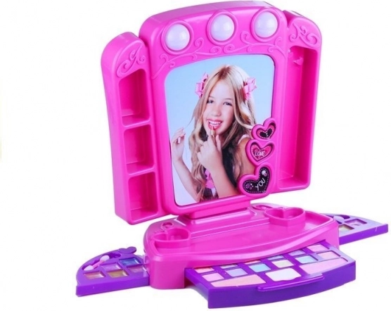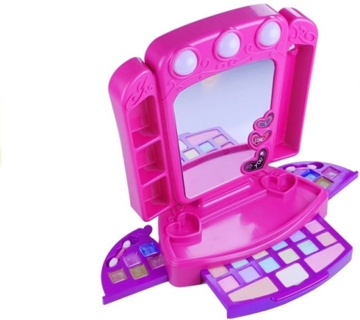 Foran finder du en skuffe fyldt med farverige skygger og blush; der medfølger en applikationssvamp og dobbeltsidede pincetter. I de trekantede kassettebokse på siderne er der glitrende lipgloss i en bred palet af nuancer fra rosa til gul og blå. To kroge ved siden af spejlet er ideelle til at hænge perler eller kæder, så de ikke filtrer sammen.