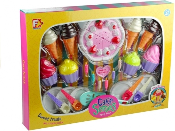 Sættet indeholder 32 dele til at arrangere imaginære fødselsdagsfester med kager, is og muffins.