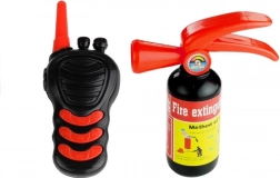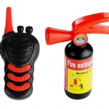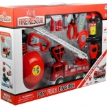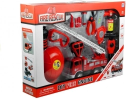 - brandbil med udtrækkelig stige, hjelm, briller, maske, brandslukker, walkie-talkie, sav, tang, skruetrækker og andet værktøj med bits