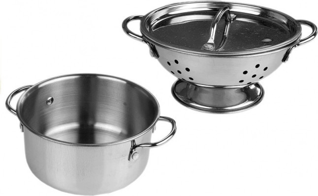Indeholder grundlæggende køkkenbehov, såsom gryde, pander og dørslag, ideel til at lege køkken.