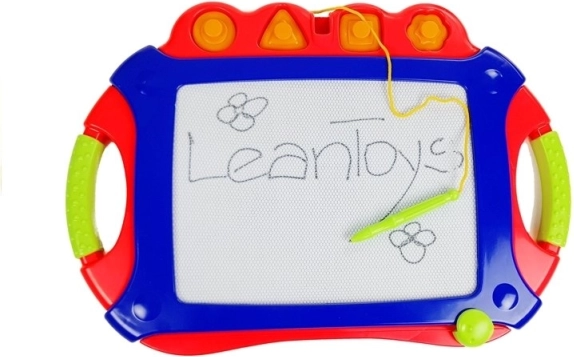 Det præsenterede sæt består af en tavle i imponerende størrelse, en stylus og fire stempler i form af geometriske figurer. Den store magnetiske tavle er kendetegnet ved neutrale, behagelige farver – klassiske farver, der vil glæde både piger og drenge.På siderne er der håndtag for nem transport af legetøjet.