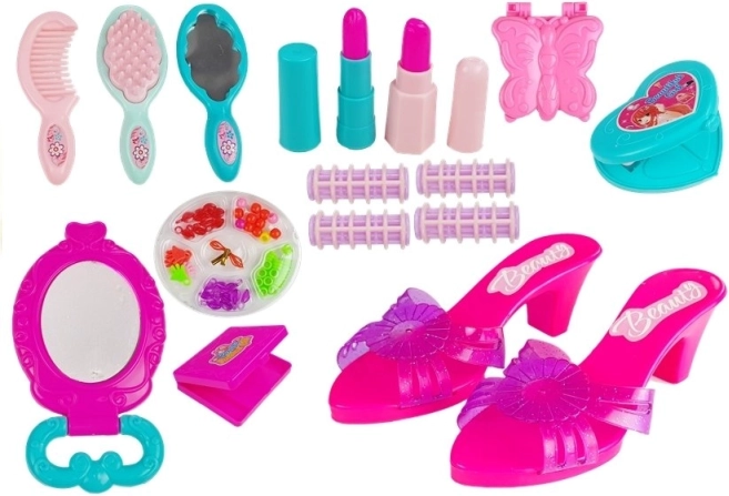 Pakken indeholder alt det nødvendige til små stylister: behagelige plastiksandaler, et hårstylingssæt inklusive børste, kam og curlere, ovalt spejl, perler til smykkefremstilling og imitationer af læbestifter. Alt er pænt organiseret i en kuffert med hank og kliklåg, så intet bliver væk, og oprydningen er legende let.