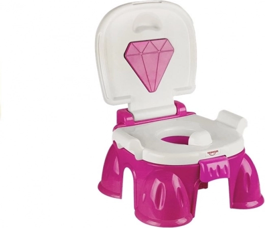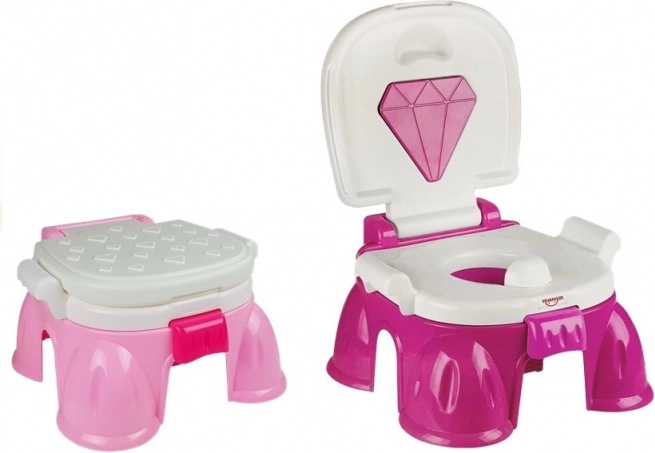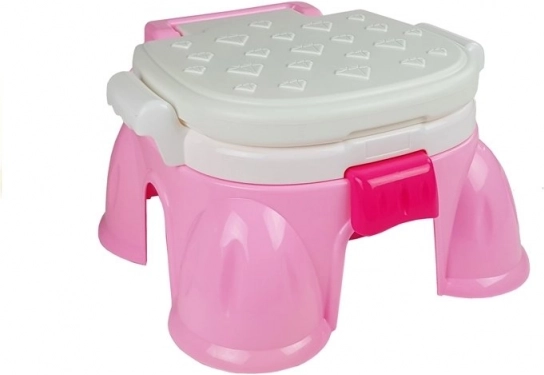 Praktisk 3-i-1 potte til småbørn i elegant pink-hvid farve med stilfuldt diamantmønster på ryglænet. Tilbyder funktioner som potte, toiletreducer og skammel med skridsikker overflade. Let og bærbar, nem at rengøre og hjælper børn med at klare pottetræning komfortabelt og sikkert.