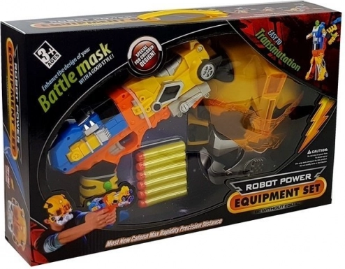 Sjovt sæt til små eventyrere: skumblaster 2-i-1 til børn med robotkampsmaske og 6 bløde pile. Nem opladning, sikkert design uden skarpe kanter og mulighed for at transformere blasteren til en robot giver timevis af kreativ og sikker leg.