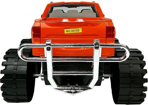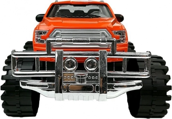 Orange truck med markant affjedring, kromgrill og robust konstruktion til leg både inde og ude.