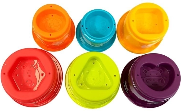 Kopper med huller muliggør leg i vand, hvor forskellige vandstråler gør badetiden til en glædelig oplevelse. Børn over seks måneder elsker dette produkt.