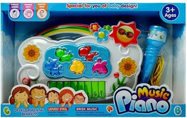 Klaveret har 8 tangenter og fem dyreelementer (kat, papegøje, hest, får, elefant), som placeres de rette steder – en fantastisk form for underholdning og træning af finmotorik. Legetøjet tilbyder valg af 2 sprog (engelsk, spansk) til legende indlæring af ord og lyde.