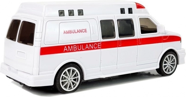Hvidt design med røde elementer og tydelig teksten AMBULANCE, detaljerede hjul og vinduer – præcis som en ægte ambulance, der inspirerer til redningsleg.