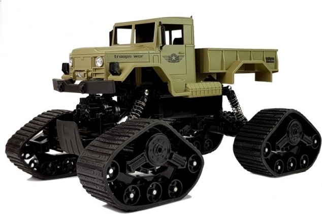 Dette robuste terrængående modelkøretøj er designet til maksimal underholdning i enhver omgivelse. Bælterne øger grebet og fremkommeligheden, mens firehjulstræk og uafhængigt ophæng hjælper med at forcere sten, sand, sne og græs. Med to motorer har bilen kraft nok til stigninger og præcis kontrol.