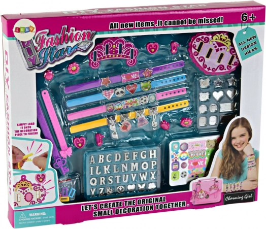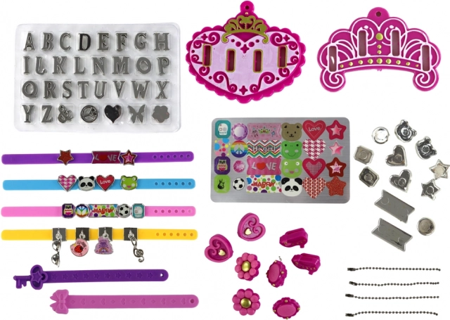 - Bogstaver A–Z, klistermærker med tekster og mønstre, store vedhæng, 4 remme til armbånd (trykknap-lukning), kæder til vedhæng, forskellige former til påklistring