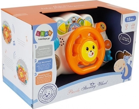 Læringsrattet efterligner et rigtigt instrumentbræt og understøtter naturlig legelæring. Barnet vil nyde blinkende lys, reelle lydeffekter og enkle betjeningsdele tilpasset små hænder. Takket være de kompakte mål er det en fantastisk ledsager på farten og til daglig leg.