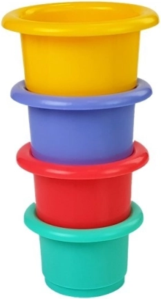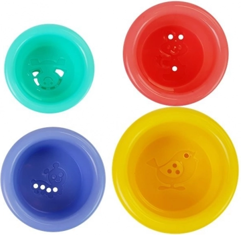 Sættet inkluderer 4 farvekoordinerede spande, der kan stables. På bunden af dem er der forskudt huller, hvorigennem forskellige vandstrømme kan observeres. Hver spand er dekoreret med graverede dyrefigurer, som for eksempel en fugl, orm, kanin og skildpadde. Dette legetøj er ikke kun sjovt, men hjælper også børn med at lære farver og udvikle deres motoriske færdigheder.<2137>