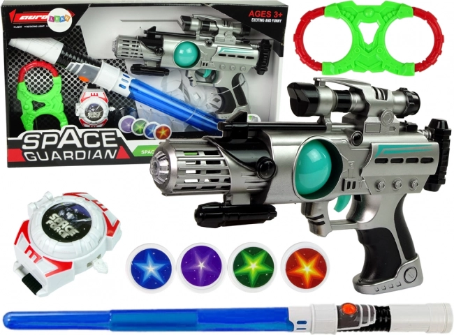 Sættet af rumvåben Space Guardian er en fuld pakke til alle små eventyrere. Det er udstyret ikke kun med en laserpistol, men også et lyssværd, legekampe og en diskudskyder for en omfattende spiloplevelse. Med lys- og lydeffekter er leg med dette sæt mere engagerende og kreativt.