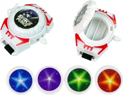 Diskudskyderen kan bæres på håndleddet og bruges til at skyde med farvede disks, hvilket tilføjer en ekstra spændingsgrad til legen.
