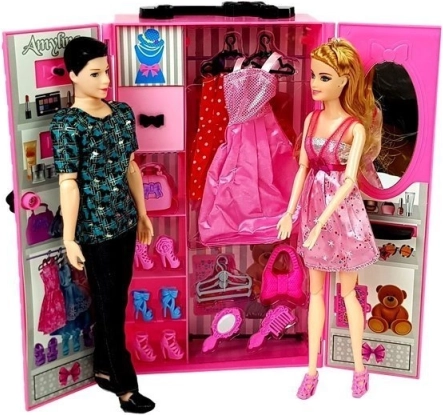 - I pakken finder du: garderobeskab/kuffert, skuffe, 2 dukker (dreng og pige), 2 kjoler (rosa med glitrende korset, rød med prikker), 2 håndtasker med sløjfe, spejl, kam, 2 bøjler, 3 par sko.
