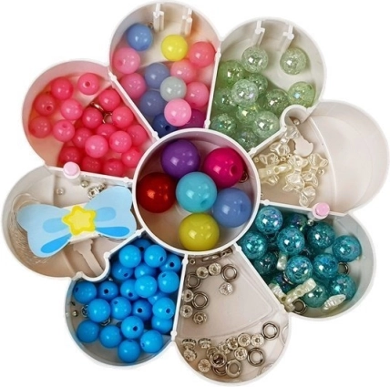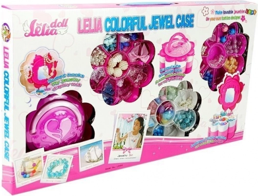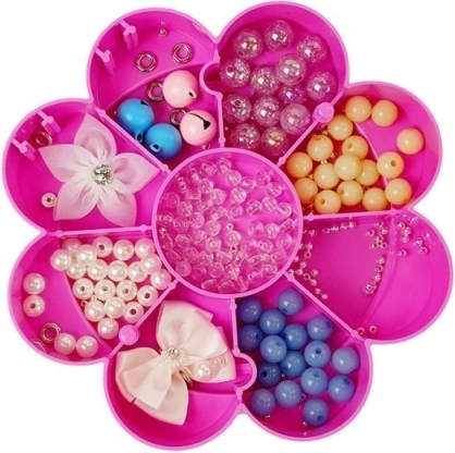 Dette børnesæt til fremstilling af smykker forvandler enhver idé til originale armbånd, halskæder eller vedhæng. Den blomsterformede kuffert med tre niveauer og praktiske rum holder perlerne pænt organiseret og altid lige ved hånden. Spejlet i den øverste del gør det muligt straks at prøve de færdige pynt og justere looket.