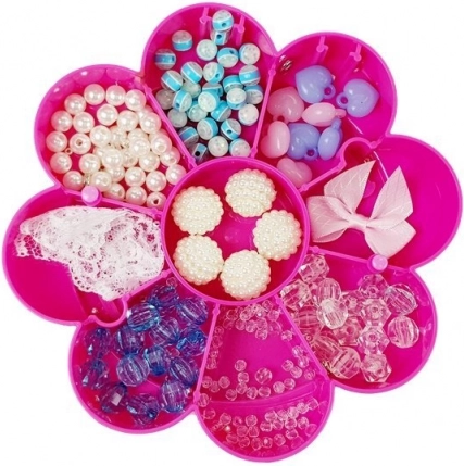 Den praktiske kuffert i lyserød-hvid farve er formet som en blomst og har flere rum til overskuelig sortering af perler og tilbehør. Alt er altid klar til at skabe.
