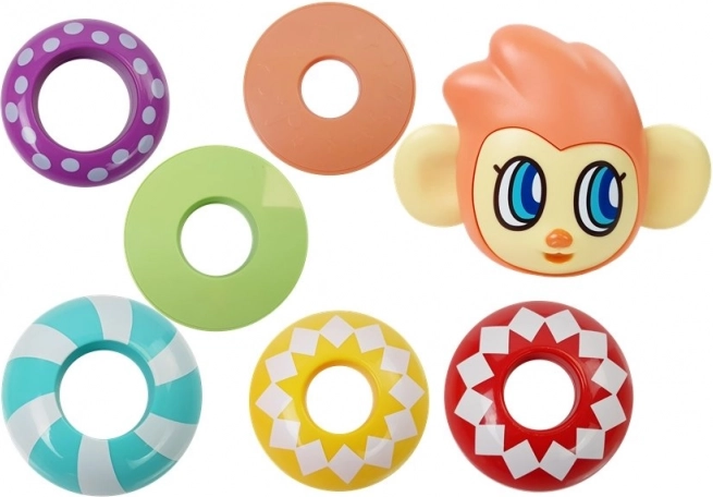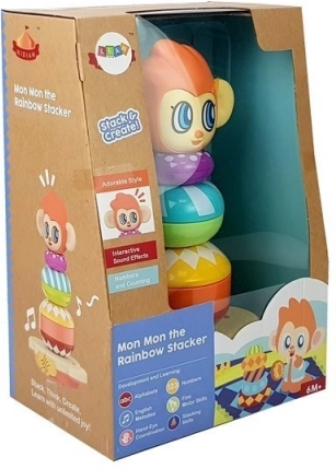 Det attraktive abemotiv og de livlige farver fastholder barnets opmærksomhed og motiverer til mere udforskning og stabling.