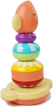 Den pædagogiske abe-pyramide byder på farvede ringe i forskellige størrelser, som barnet stabler på en stabil base. Hver korrekt placeret del udløser engelske talord, så leg og læring naturligt hænger sammen. Det færdige tårn belønnes med glad applaus, som styrker motivation og glæden ved at lykkes.