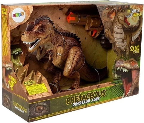 Den interaktive dinosaur begejstrer alle fans af forhistorien og actionfyldte fortællinger. Når den tændes, bevæger den sig fremad, der høres fodtrin og et frygtindgydende brøl, og øjnene lyser rødt. Ved at trykke på aftrækkeren på pistolen starter du kampen – hvert træf udløser lys- og lydeffekter; ved det niende træf falder T-rexen om og afgiver en nederlagseffekt.