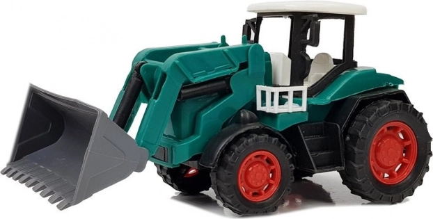 Grøn gravemaskine med frontlæsser og bevægelig skovl, ideel til at simulere byggearbejde.