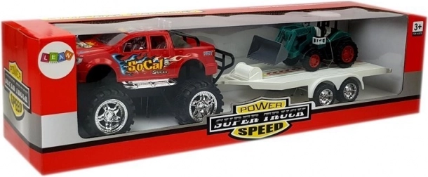 Hele sættet, som indeholder bil, trailer og gravemaskine, leveres i en attraktiv emballage med gennemsigtigt vindue.