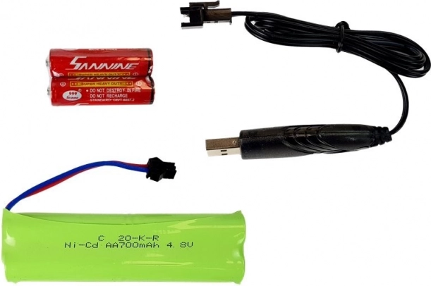 - Batteri 4,8 V / 700 mAh inkluderet, controller bruger 2× AA (ikke inkluderet).