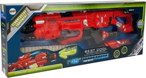 Børnevåbenet, som lyser i mørket, er det perfekte tilbehør til ethvert barn, der elsker fantasifuld leg. Det er udstyret med lyseffekter, der tilføjer et helt nyt element til legen. Magasinet lyser med hvidt lys og gør projektilerne synlige, selv i mørket. Laserkomponenten markerer skuddets bane, og hver affyring laver en realistisk skydelyd.