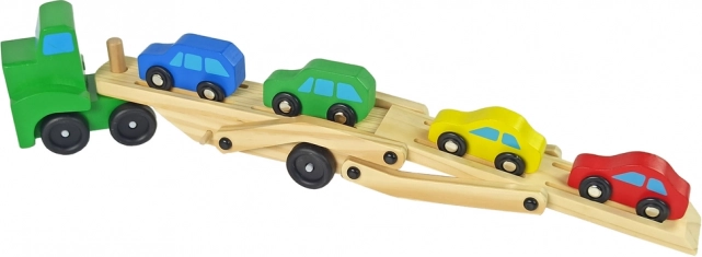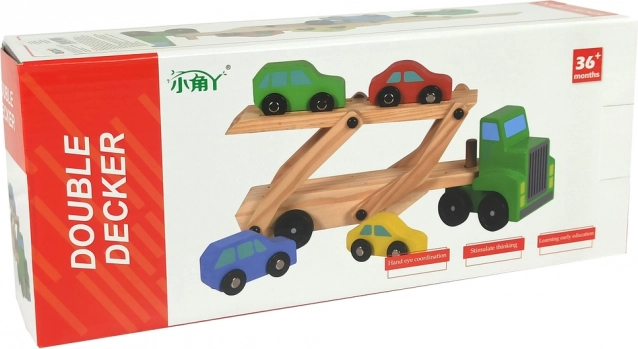 Denne træ-autotransporter vil glæde enhver lille motorentusiast. Sættet indeholder en robust lastbil med to-etagers transportdæk og 4 farverige små biler. Takket være den nedklappelige (udklappelige) rampe kan bilerne nemt køre op på dækket og transporteres sikkert.