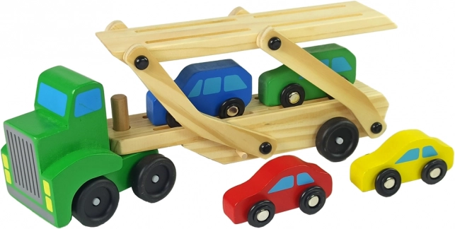 Grøn træ-autotransporter med 4 små biler. Udklappelig rampe, kvalitets træ, sikre farver, CE-certificering. Fantastisk gave til børn fra 3 år.