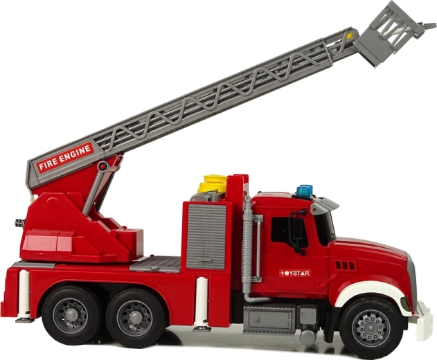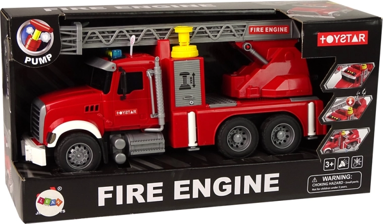 Bilen har i den øverste del af kabinen en gul åbning, hvorigennem vand let kan hældes ind. Når du trykker på den flere gange, vil du se vand strømme ud af slangen, der er monteret på det angivne sted. Din lille hjælper er klar til action! Tryk på knappen øverst på beholderen og se vandet begynde at løbe! Den kan slukke små brande. Stigen hæves ved hjælp af et håndsving.
