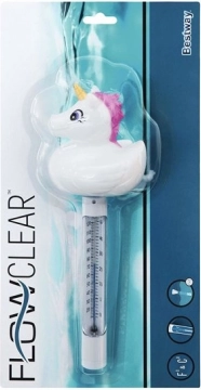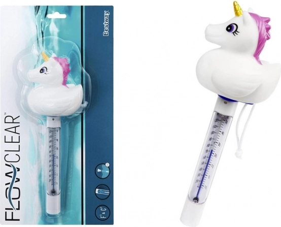 Stilfuldt flydende BESTWAY-termometer formet som en enhjørning er et praktisk tilbehør til enhver pool. Måler nemt vandtemperaturen i °C og °F, og takket være den flydende konstruktion bliver det på vandoverfladen. Med snor kan det fastgøres på et valgfrit sted. Fremstillet af holdbart ABS for lang levetid.