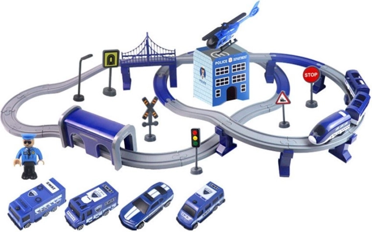 Politibyen har en politibase, 5 køretøjer og skinner. Alt holdt i blå farver. Det batteridrevne tog kører med 203 km/t.