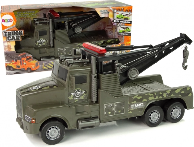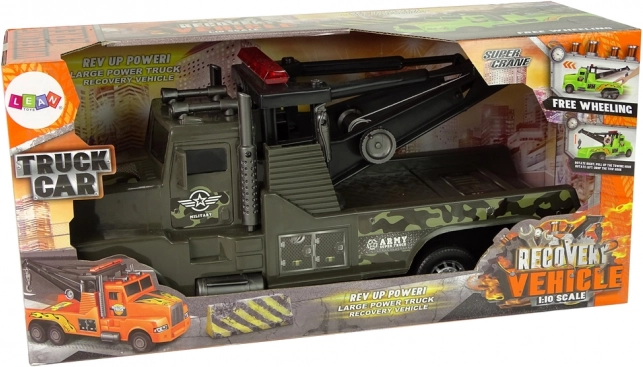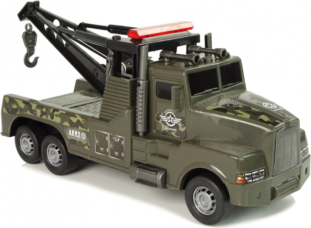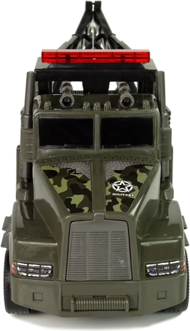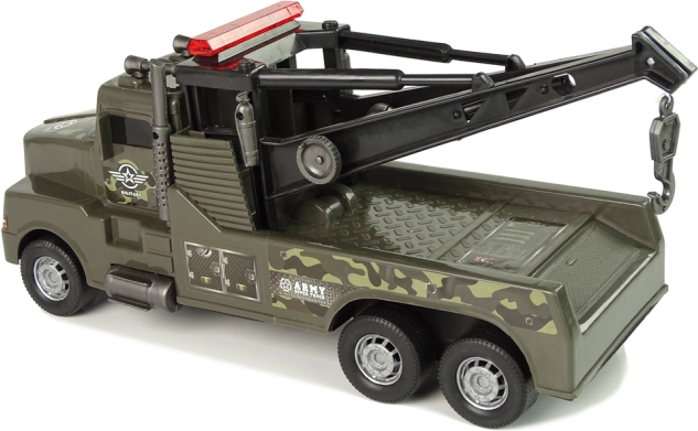 Denne plastiske autotransport med camouflageprint og militære klistermærker begejstrer alle børn, der elsker action- og redningsmissioner. Bagpå sidder en kran med spil, der kan trækkes ud ved hjælp af et sidehåndtag, med en stærk krog i enden for nem fastgørelse af andet legetøj.